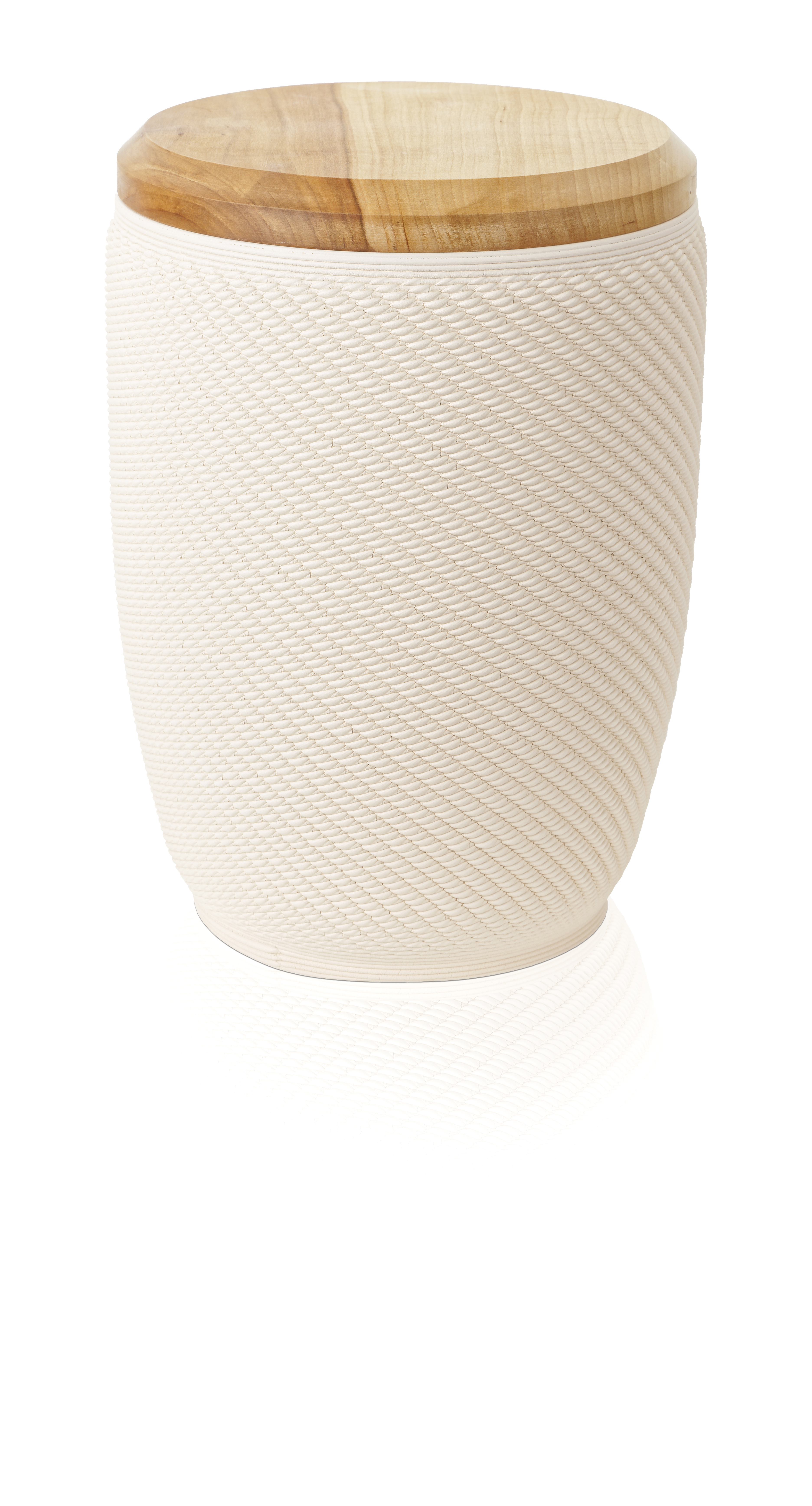 Die Herstellung dieser Keramikurne erfolgt mittels 3D-Druck. Aufgrund der leichten Brandstufe ist diese vergänglich.