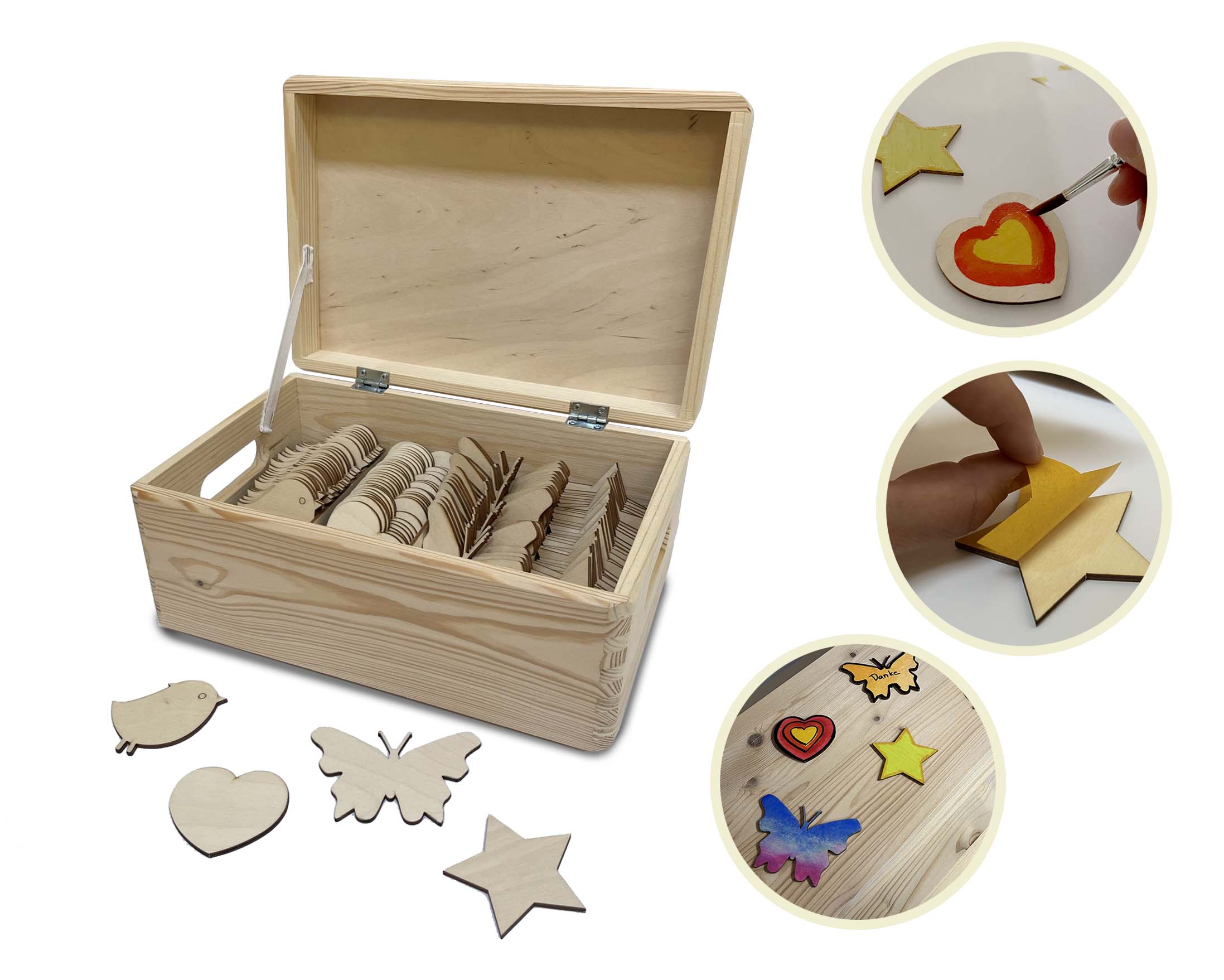 Oiseaux (30 pcs.), cœurs (30 pcs.), papillons (20 pcs.), étoiles (30 pcs.),