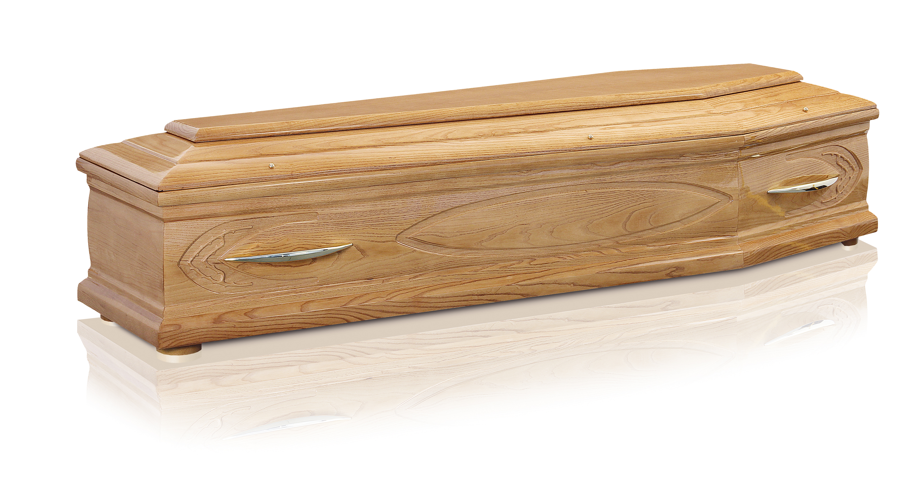 Cercueil en contre-plaqué peuplier plaqué chêne fineline couleur naturel, patiné clair, verni brillant pieds d'encadremen...