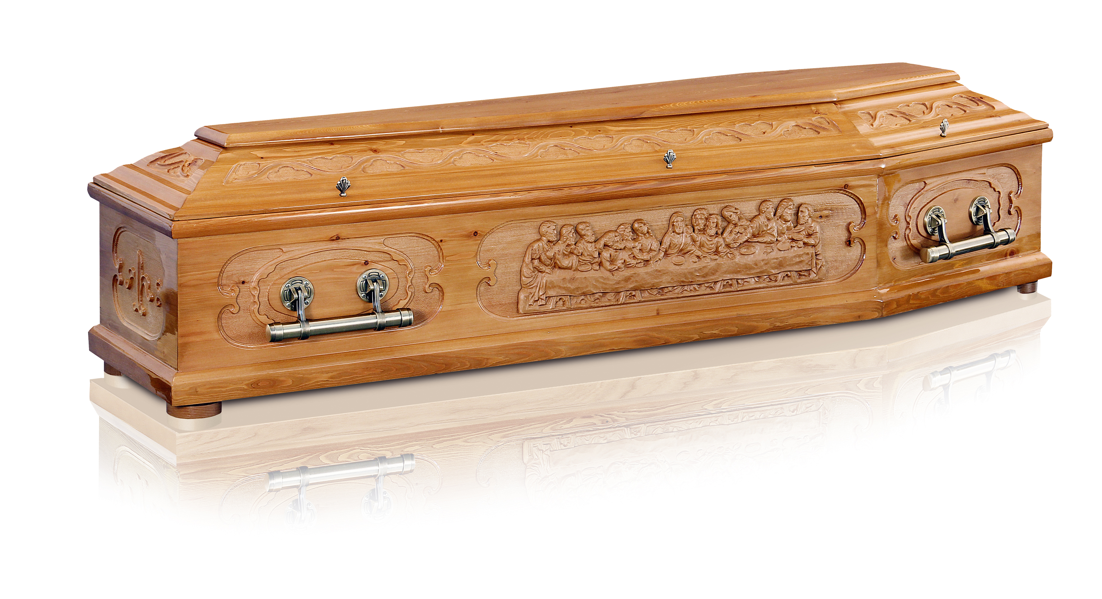 Cercueil type italien mélèze massif couleur foncé, verni brillant pieds rondelles cène christ boules décoratives VC...