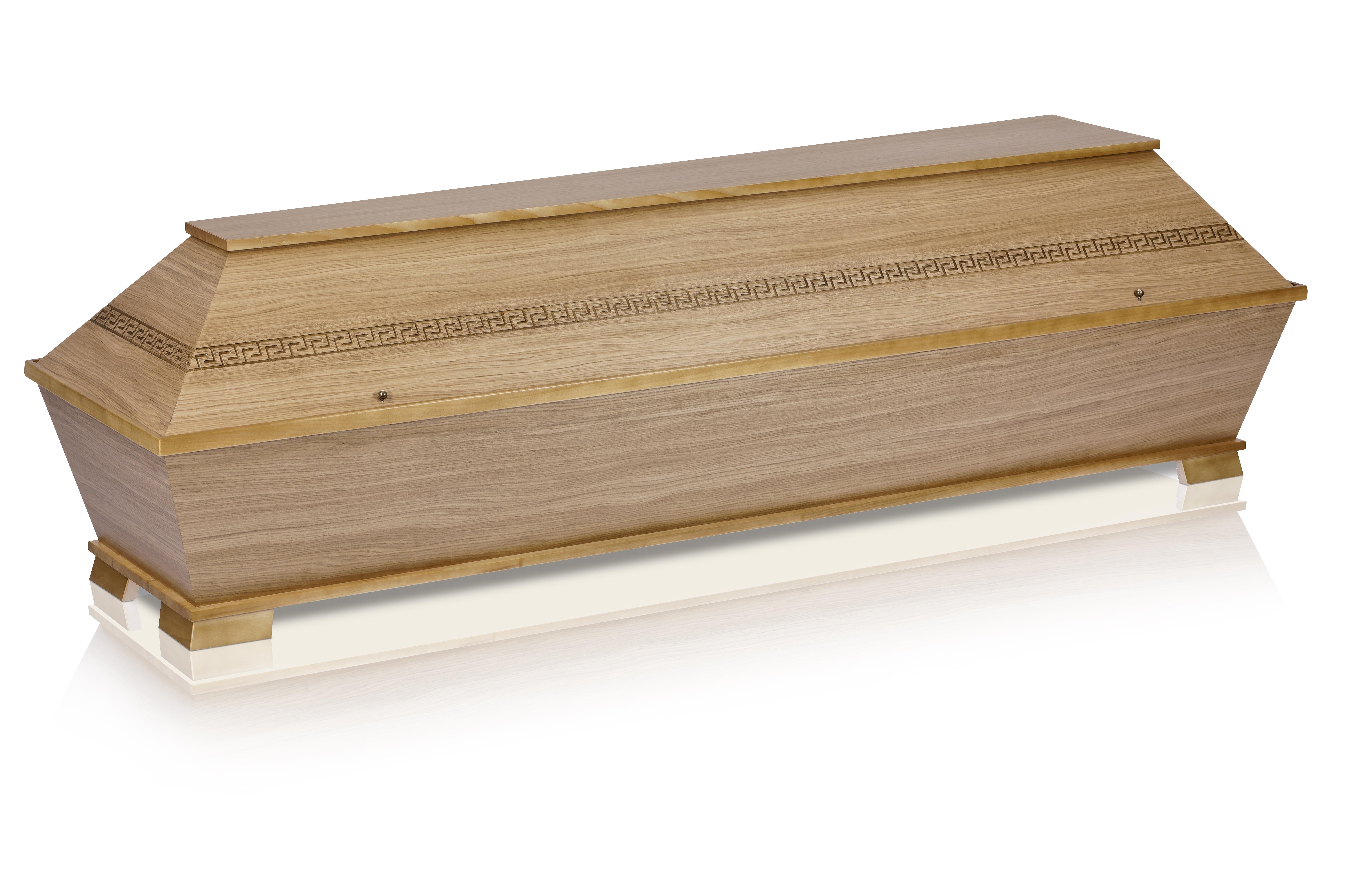 Cercueil en contre-plaqué peuplier plaqué chêne fineline couleur naturel, patiné clair, verni brillant pieds d'encadremen...