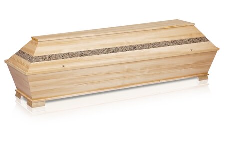 Cercueil en sapin massif couleur clair, verni demi-transparent pieds d'encadrement 3 encradrements fraisés vis décorativ...